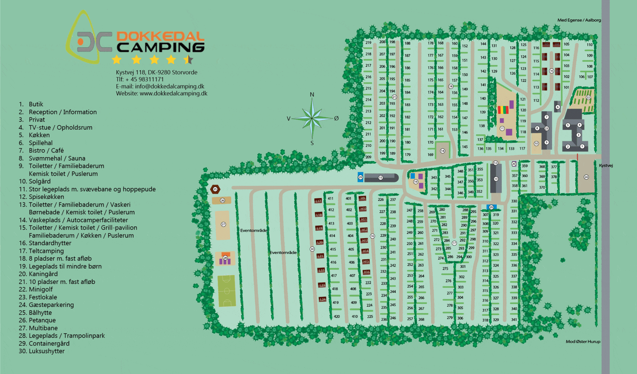 Svømmehal, bistro, legepladser, købmand osv.